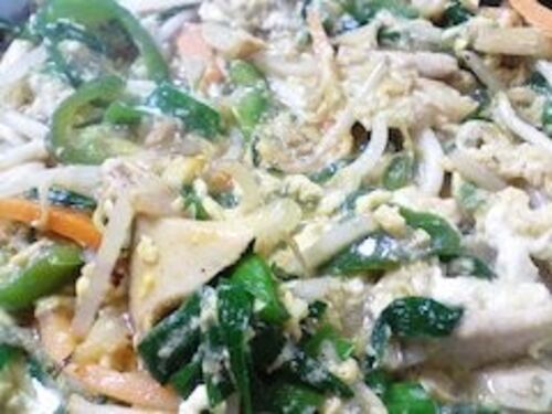 野菜炒め卵とじ 中華クラゲと胡瓜の和え物 茄子の煮物 ご飯 トマトと玉子のスープ