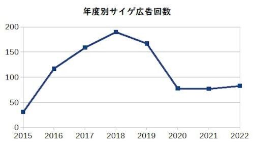 2022年度の週刊少年漫画誌の裏表紙広告は、Cygames関連が全体の43.0%を占めていました。 全193回のうち、83冊がサイゲ関連の広告。 年度別グラフで見るとこう。2019年まではチャンピオンにも出稿してたのが、2020年から無くなったためこんなグラフ。 今年の…