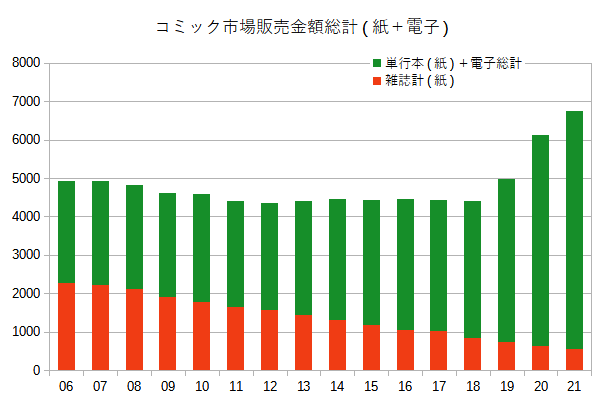 2021年、コミック市場全体は前年よりも633億円、10.3%増。